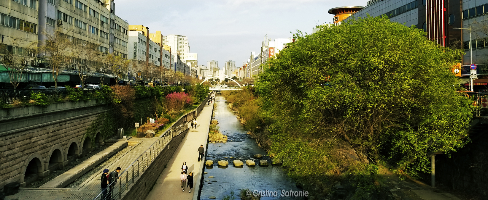 Are 11 km lungime si trece prin centrul capitalei Seul, de la vest la est. O oaza ce azi se afiseaza cu cutezanta prin jungla de cladiri inalte si moderne de sticla si pe sub 22 de poduri – cele vechi au fost refacute si gloria lor de odinioara restaurata, acestora adaugindu-li-se multe noi, din evidente ratuni de trafic. Se spune ca este unul dintre cele mai mari din lume proiecte de design urban de restaurare a unui curs de apa, pe malurile caruia acum se plimba zilnic in jur de 60.000 de persoane!