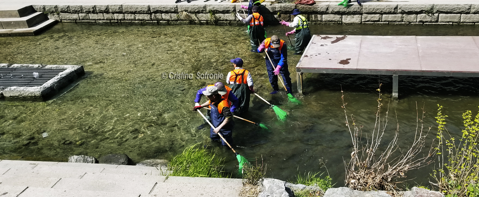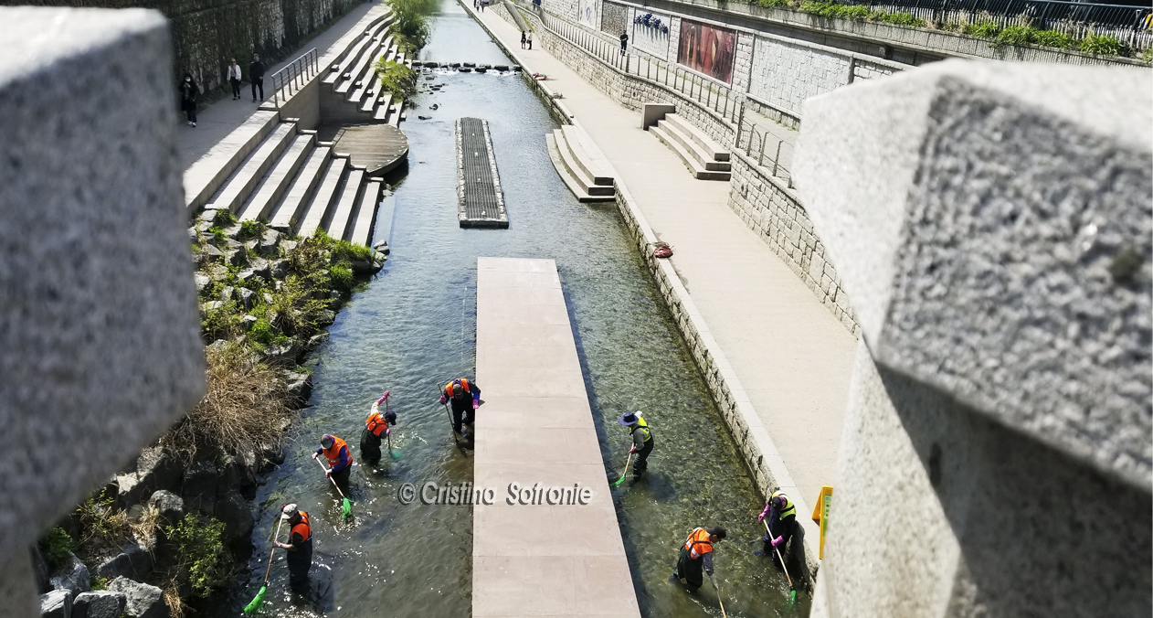 O apa cristalina acum, in care vezi clar formele pietrelor si pestii cum inoata. Si in 2016 si in 2017 m-am plimbat deseori pe malurile Cheonggyecheon. Dar niciodata in aprilie. Asa ca abia astazi, 18 aprilie 2018, am inteles cum este intretinuta apa atit de curata.